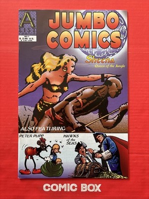 The product is a comic book featuring Sheena, Queen of the Jungle, from the Jumbo Comics series. Set in the jungle genre, this US comic book likely showcases exciting adventures with characters like Peter Pupp and the Hawks. Fans of vintage comics and action-packed storytelling may enjoy this classic piece of comic book history.
