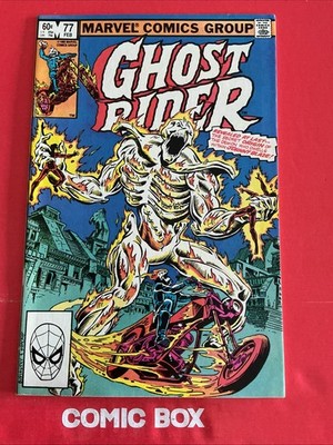 The product is a vintage copy of Marvel Comics Ghost Rider #77 from 1982, a part of the Ghost Rider series published by Marvel Comics in the US. This comic book falls within the Bronze Age of Comics, known for its distinctive art and storytelling style. With the iconic Ghost Rider character and published by Marvel Comics, this issue is a valuable and sought-after collectible for comic book enthusiasts and fans of the supernatural series.